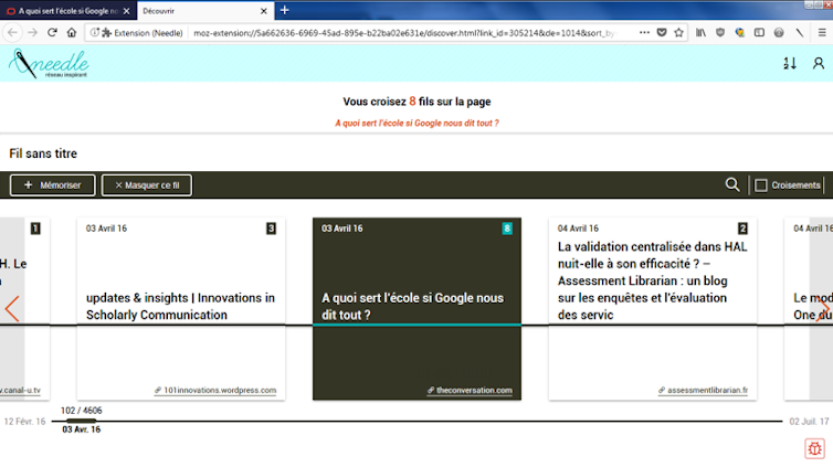 En retour, Needle vous donnera immédiatement accès aux fils de tous ceux qui auront fait de même. Pour enrichir votre propre fil et augmenter les sources de découverte, vous pourrez réitérer l’opération à partir de chaque article qui vous inspirera, sur The Conversation France comme ailleurs.